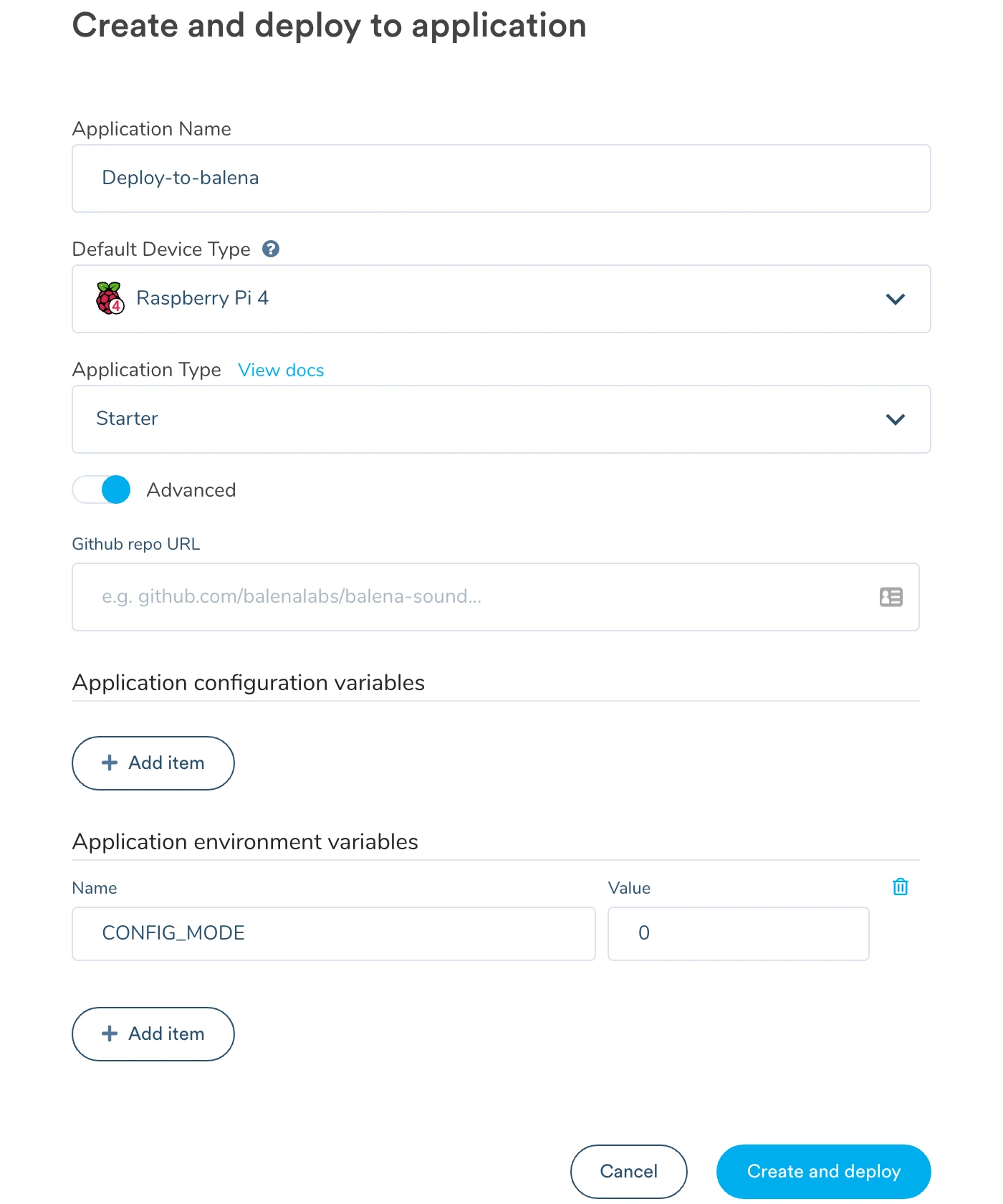 Clicking the Deploy with balena button opens the balenaCloud dashboard with a modal window pre-populated with everything required to deploy a fleet. Clicking the Advanced toggle in the modal window allows adding additional configuration options. If the project has provided configuration variables via a configuration file, then they are pre-populated in this section.